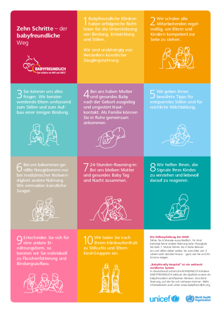 Die WHO gibt 10 umfassende Schritte vor, die auf dem Weg zur zertifizierten Klinik erfüllt werden. Bindungsförderung, Raum zum gemeinsamen Ankommen und eine kluge Stillbegleitung zeichnen die babyfreundlichen Ergebnisse aus.