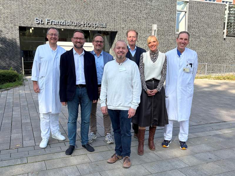 Herzlicher Empfang: Robert Pawlitzek (vorne Mitte) wurde von (v. l. n. r.) Dr. Norbert-Wolfgang Müller, Ralf Peters, Thorsten Keuschen, Winfried Mertens, Melanie Klatt und Dr. Frank Klammer im St. Franziskus-Hospital Ahlen begrüßt.